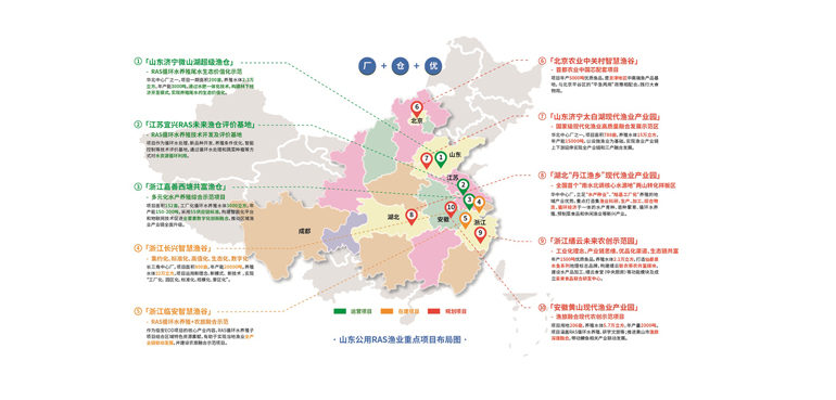 商達(dá)公用集團(tuán)在RAS循環(huán)水養(yǎng)殖領(lǐng)域依托專業(yè)的運(yùn)營公司——山東公用設(shè)施漁業(yè)有限公司,采用Sound5.0未來漁工廠和“廠+倉+優(yōu)”產(chǎn)業(yè)布局。十四五期間規(guī)劃投資建設(shè)運(yùn)營高標(biāo)準(zhǔn)工廠化養(yǎng)殖水體100萬立方,預(yù)計(jì)產(chǎn)能8萬噸/年。目前已在運(yùn)營和規(guī)劃的項(xiàng)目包括濟(jì)寧微山湖超級(jí)漁倉項(xiàng)目、江蘇宜興評(píng)價(jià)基地、浙江嘉善西塘共富漁倉、浙江長興智慧漁谷、浙江臨安智慧漁谷等多個(gè)EOD和設(shè)施漁業(yè)項(xiàng)目。